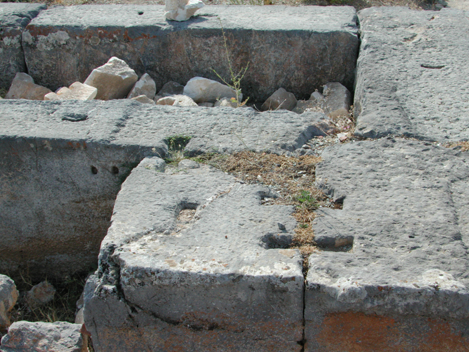 Dove-tail clanp holes in the foundations of the Nymphaeum.