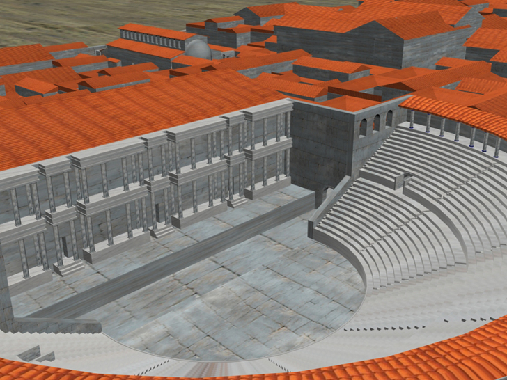 The cavea (seating area) and scaenae frons (decorative stage fascade) of the Theater with the Basilica "of St. Paul" at top.