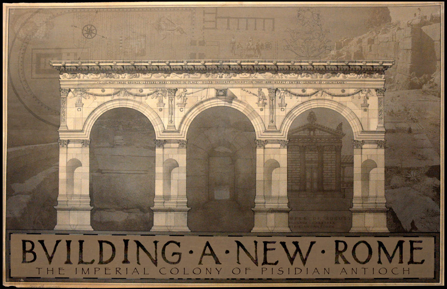 Conceptually, this work of digital art - entitled "Envisioning Antioch" - is intended to embody the elements of the exhibition and each of its sections using artifacts brought back to the Kelsey in 1927, the drawings of Frederick Woodbridge from the 1927 Michigan expedition, and digital images from the 2004 expedition. It was used to create promotional posters, postcards, the cover of the exhibition catalogue, and a large banner to hang from the upper balcony of the Kelsey Museum. The foundation of the image is the drawing of the Hadrianic City Gate [1 - see key below] done by Frederick Woodbridge from studies during the 1927 Michigan expedition. Merged into this image from top left are: a mosaic fragment from the Basilica [2], a plan of the Imperial Cult Sanctuary (Woodbridge) [3], an ornate compass rose (Woodbridge) [4], a meander from the Theater [5], a fragment of the Res Gestae inscription of Augustus [6], William Ramsey on a donkey with two Turkish guides (1912) [7], the acroterion from the Imperial Cult Sanctuary (Woodbridge) [8], and the outer temenos wall of the Temple of Men with Lydia Herring and Hima Mallampati looking toward Antioch [9]. Lower register from the left: the seats of the Theater [10], the north porch of the Basilica with a cross-inscribed capital [11], a doorway into the Bath substructures [12], an elevation of the Imperial Cult Temple (Woodbridge) [13], and the Cascade north of the City Gate [14]. This work took shape over the Fall of 2005, reaching its final form in the eleventh version. This reproduction is less than 1/4 the scale of the source file of "Envisioning Antioch," which weighs in at 450 Mb. |