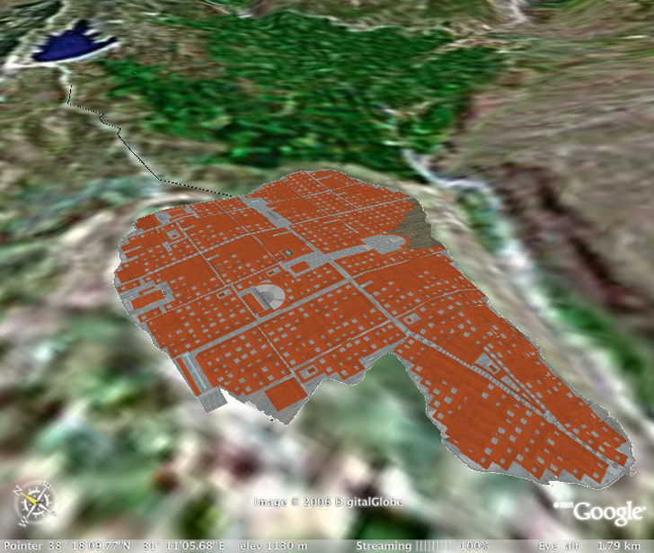 closely. To the right of the city is a steep valley with a stream at bottom.