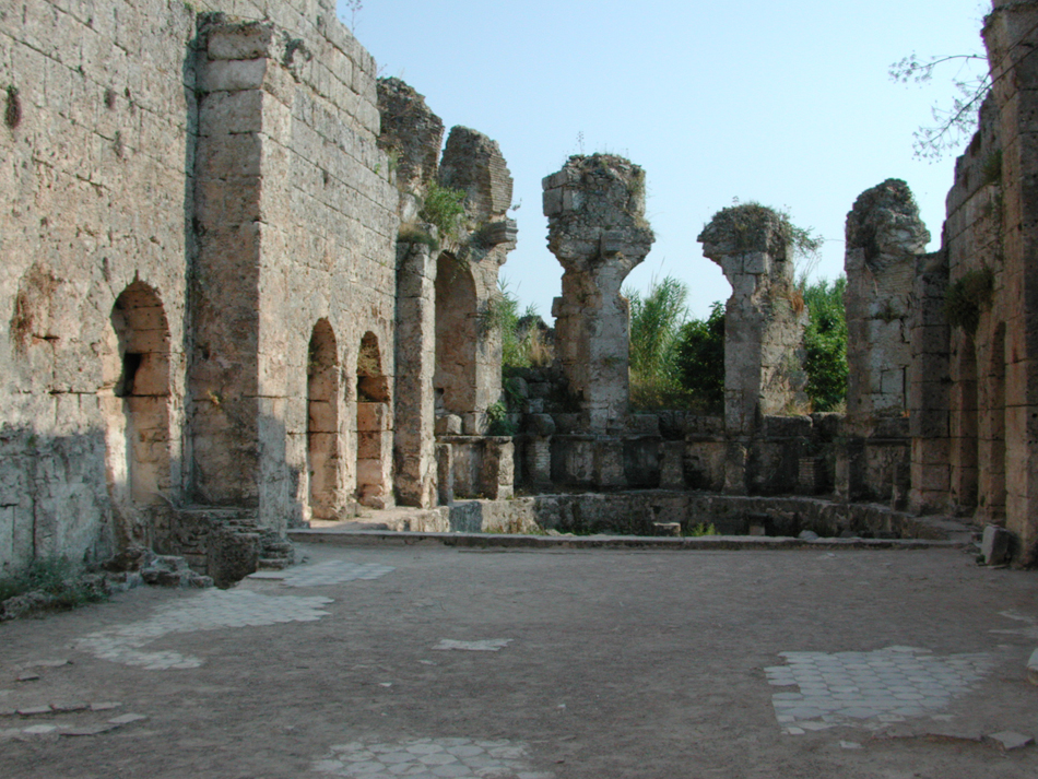 Interior of the Bath complex near the Hellenistic city gate. Opus sectile paving with a plunge pool at the far end of the room.