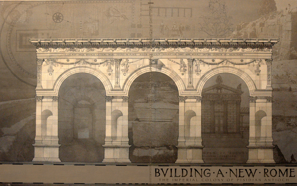 Here, there had been rearrangement to allow "Envisioning Antioch" to be printed as the cover of the exhibition catalogue. The positions of the bath doorway and the basilica north porch have been reversed to maximize the visual effect.