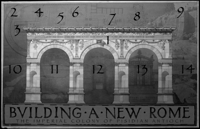 Conceptually, this work of digital art - entitled "Envisioning Antioch" - is intended to embody the elements of the exhibition and each of its sections using artifacts brought back to the Kelsey in 1927, the drawings of Frederick Woodbridge from the 1927 Michigan expedition, and digital images from the 2004 expedition. It was used to create promotional posters, postcards, the cover of the exhibition catalogue, and a large banner to hang from the upper balcony of the Kelsey Museum. The foundation of the image is the drawing of the Hadrianic City Gate [1 - see key below] done by Frederick Woodbridge from studies during the 1927 Michigan expedition. Merged into this image from top left are: a mosaic fragment from the Basilica [2], a plan of the Imperial Cult Sanctuary (Woodbridge) [3], an ornate compass rose (Woodbridge) [4], a meander from the Theater [5], a fragment of the Res Gestae inscription of Augustus [6], William Ramsey on a donkey with two Turkish guides (1912) [7], the acroterion from the Imperial Cult Sanctuary (Woodbridge) [8], and the outer temenos wall of the Temple of Men with Lydia Herring and Hima Mallampati looking toward Antioch [9]. Lower register from the left: the seats of the Theater [10], the north porch of the Basilica with a cross-inscribed capital [11], a doorway into the Bath substructures [12], an elevation of the Imperial Cult Temple (Woodbridge) [13], and the Cascade north of the City Gate [14]. This work took shape over the Fall of 2005, reaching its final form in the eleventh version. This reproduction is less than 1/4 the scale of the source file of "Envisioning Antioch," which weighs in at 450 Mb. |