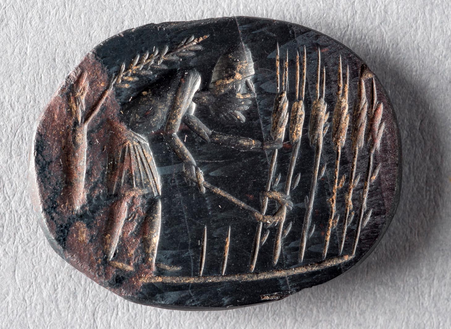 The charmingly realistic scene engraved on this amulet represents the standard iconography to signify protection against sciatica and any type of ailment affecting the lower back. On the obverse is a reaper bending to his work and cutting several stalks of grain with a long-handled sickle. The realism of the entire engraving is outstanding. There are two stubbles of cut stalks in front of the reaper, who is depicted wearing a high cap and a tunic folded at his waist to form a kilt. The insertion of the tree arching over the back of the reaper is probably an attempt to create a sense of natural perspective. But the actual meaning of this stone is only fully revealed by inspecting the reverse. It contains the inscription, σχιων, an abbreviated version of ἰσχίων, “for the hips,” which is obviously the kind of protection, or cure, needed by reapers or other laborers engaged in a similar physical work.