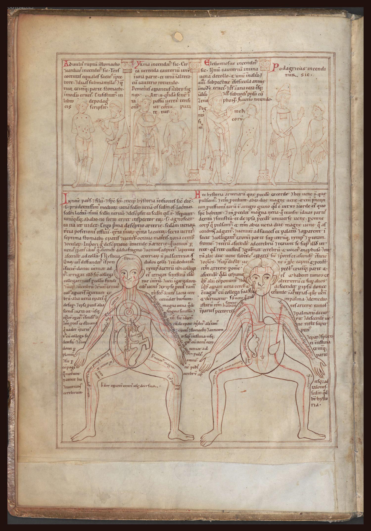 As indicated in the title, this manuscript was copied by a Benedictine monk at the Bavarian abbey of Prüfening in the second half of the twelfth century. It includes a set of anatomical drawings, the so-called five-figure series. This page depicts veins (left) and arteries (right); the next page shows bones, nerves, and muscles. These images, along with a very simplified version of Galenic texts, probably also echoing the anatomical teaching from Hellenistic Alexandria, were designed for teaching. Drawings of this style could be found in other Persian and Latin manuscripts as well.