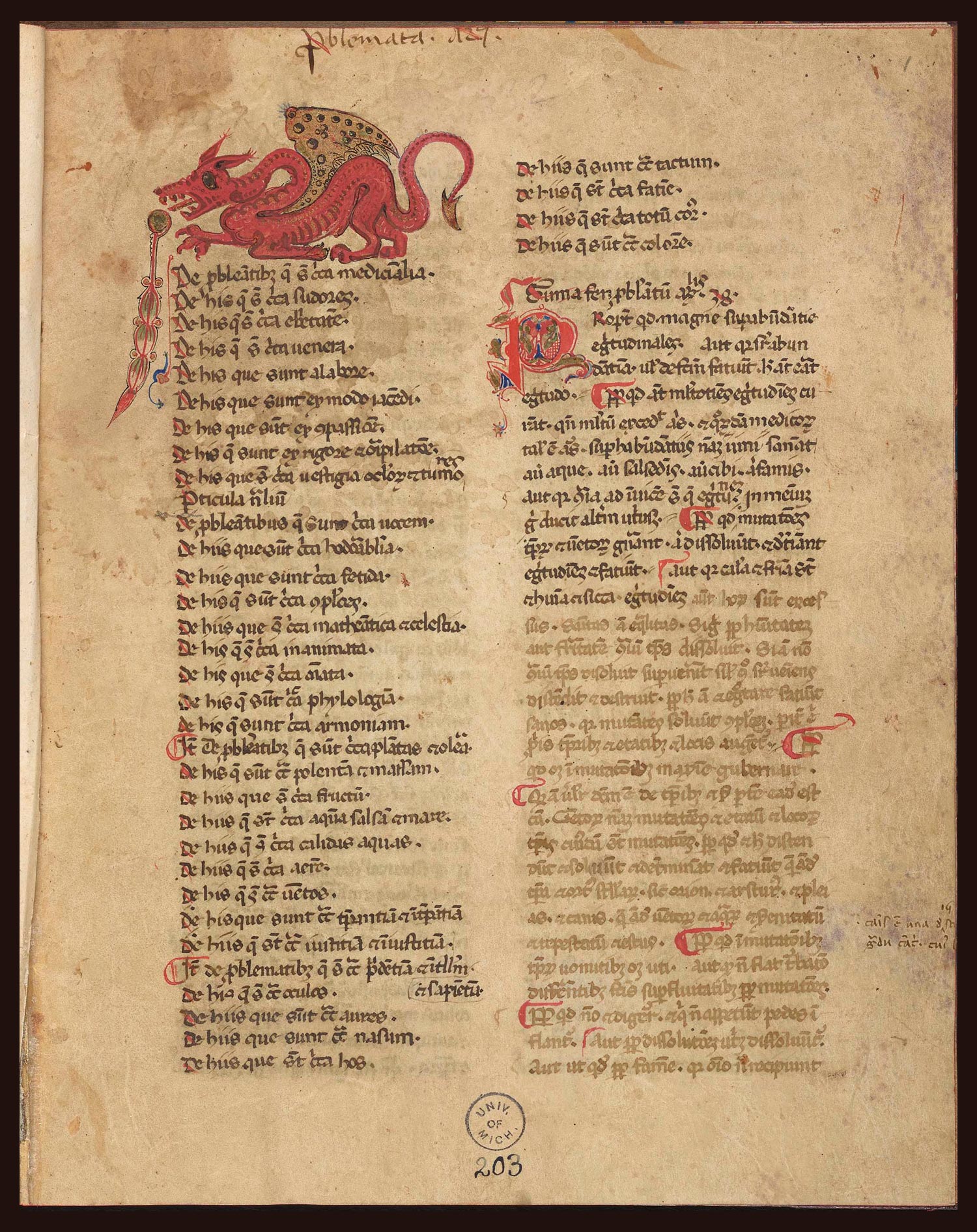 This fourteenth-century manuscript contains the Latin translation by Bartholomew of Messina (fl. 1258–1266) of the first book of the Pseudo-Aristotelian Problemata, which deals with medical matters. The striking illumination depicting a dragon is likely a playful reference to the so-called “dragon’s blood,” a red resin, which, since antiquity, was thought to have multiple uses, including medical properties to cure respiratory and gastrointestinal ailments.