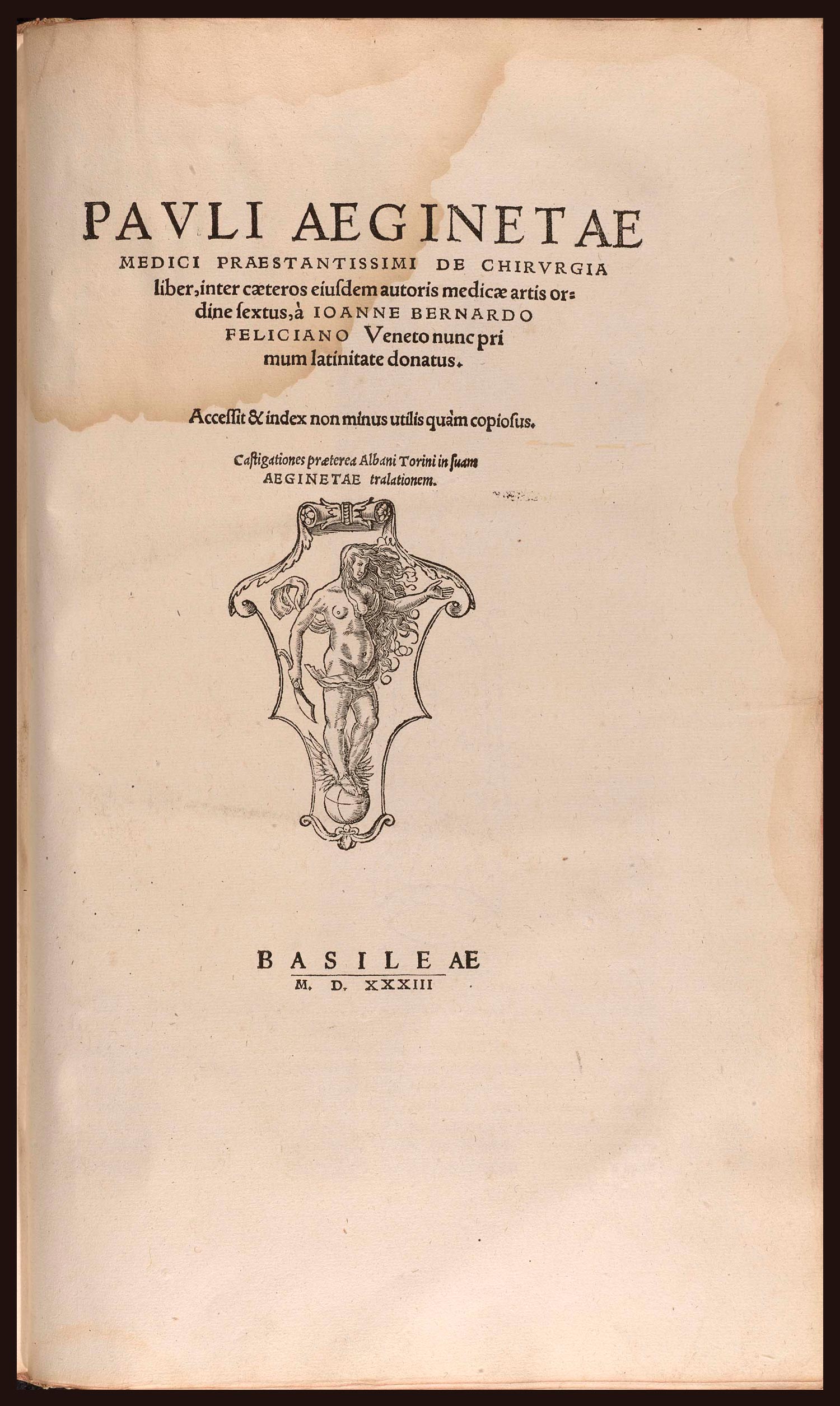 Pauli Aeginetae medici insignis opus divinum: quo vir ille vastissimum totius artis oceanum, Laconica brevitate, sensibus argutis, merisque aphorismis in epitomen redegit (Trans. Alban Thorer) Basel: Andreas Cratander & Johannes Bebelius, 1532 The Le Roy Crummer Collection