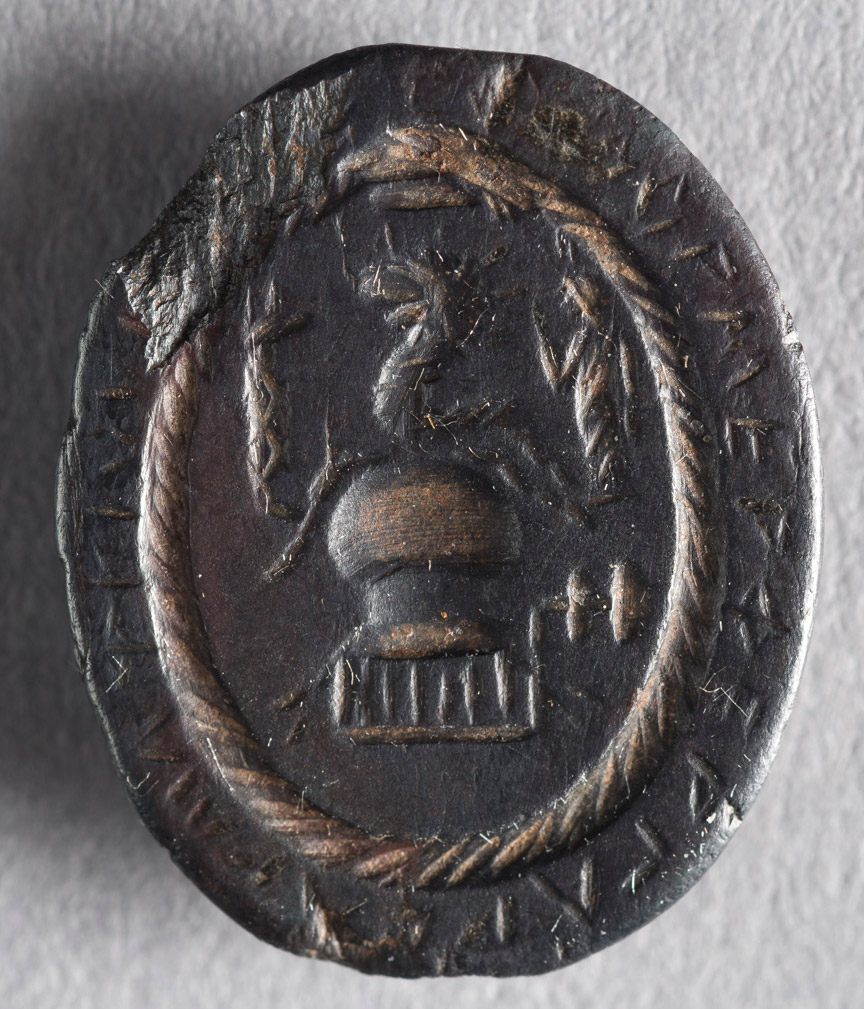 The engravings scattered on this tiny piece of hematite are again standard in uterine gemstones: Ouroboros encloses a symbolic representation of the uterus. In the upper half of the stone, on the left, we see the mummy of Anubis, the Greek name for a jackal-headed god associated with the afterlife in Egyptian religion; in the center is Chnoubis, a coiled serpent with a lion head and six rays around it, believed to prevent abdominal pain and ensure an easy childbirth. On the right is Isis, the Egyptian goddess of fertility and motherhood.