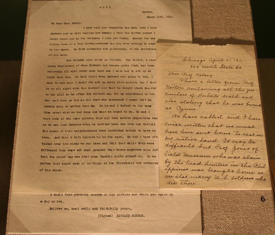 A letter of condolence from Richard Norton to Herbert De Cou's mother, Margaret, dated March 11, 1911, and a letter from Margaret De Cou to Kelsey dated April 5, 1911 Bentley Historical Library, Kelsey Museum Papers