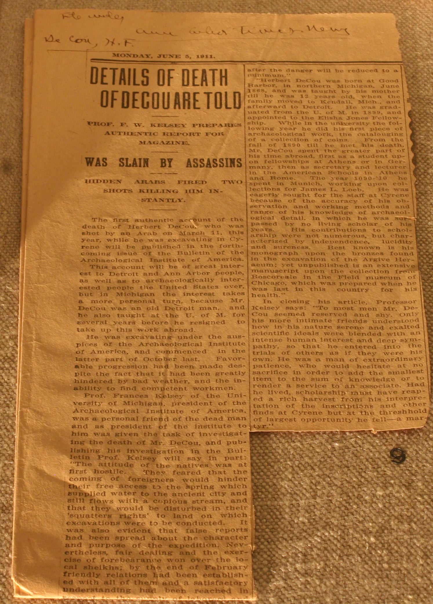 After graduating from the University of Michigan in Classics, Herbert De Cou taught in the Latin Department from time to time, but when offered a regular position in the department he chose instead to live abroad and work on Mediterranean archaeological sites. He accompanied Kelsey and his students in 1901 as a guide when they traveled around Greece and was working for the AIA's dig at Cyrene in Libya when he was shot by a local assassin while leading the workmen (in Richard Norton's absence) up to the site. Responsibility for this hostile act (and potshots had been taken at the dig house on several occasions before) has never been clearly established; but the finger of suspicion points at Italian interference prior to their invasion of Libya later in the year. In the face of that invasion, the Cyrene project was suspended, then abandoned.