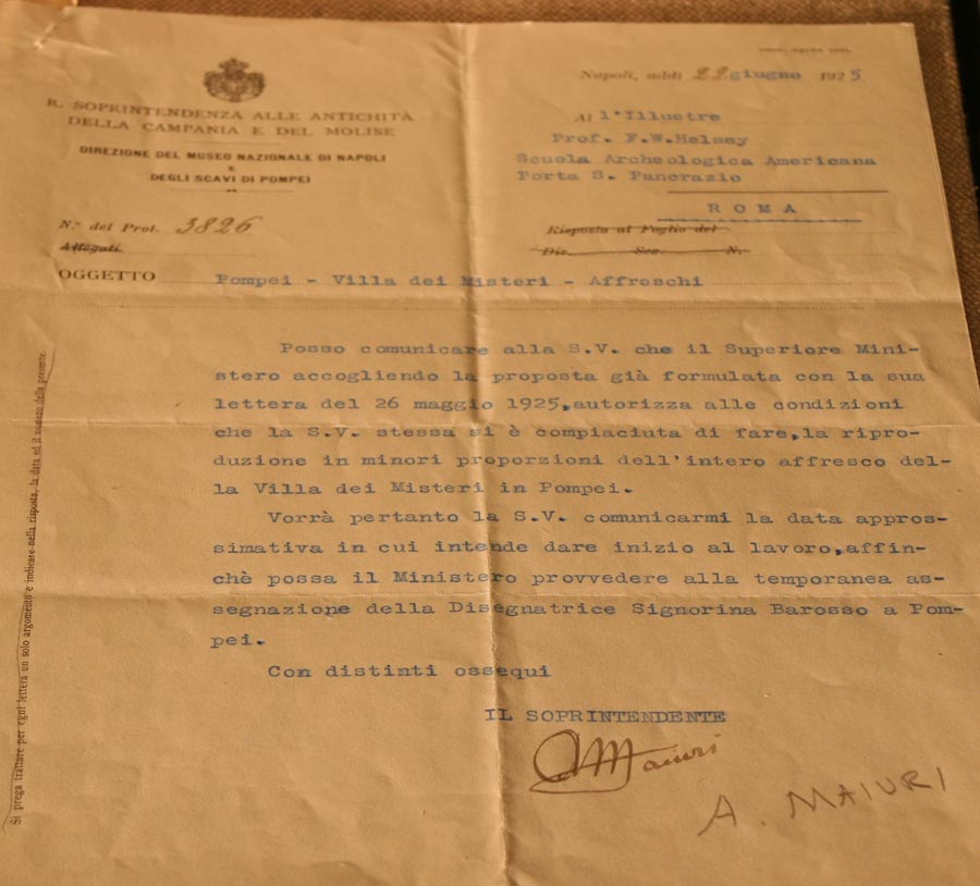 Letter dated June 22, 1925, from Amedeo Maiuri, the superintendent in Pompeii, authorizing Barosso to paint the replica of the Roman murals Bentley Historical Library, Kelsey Museum Papers