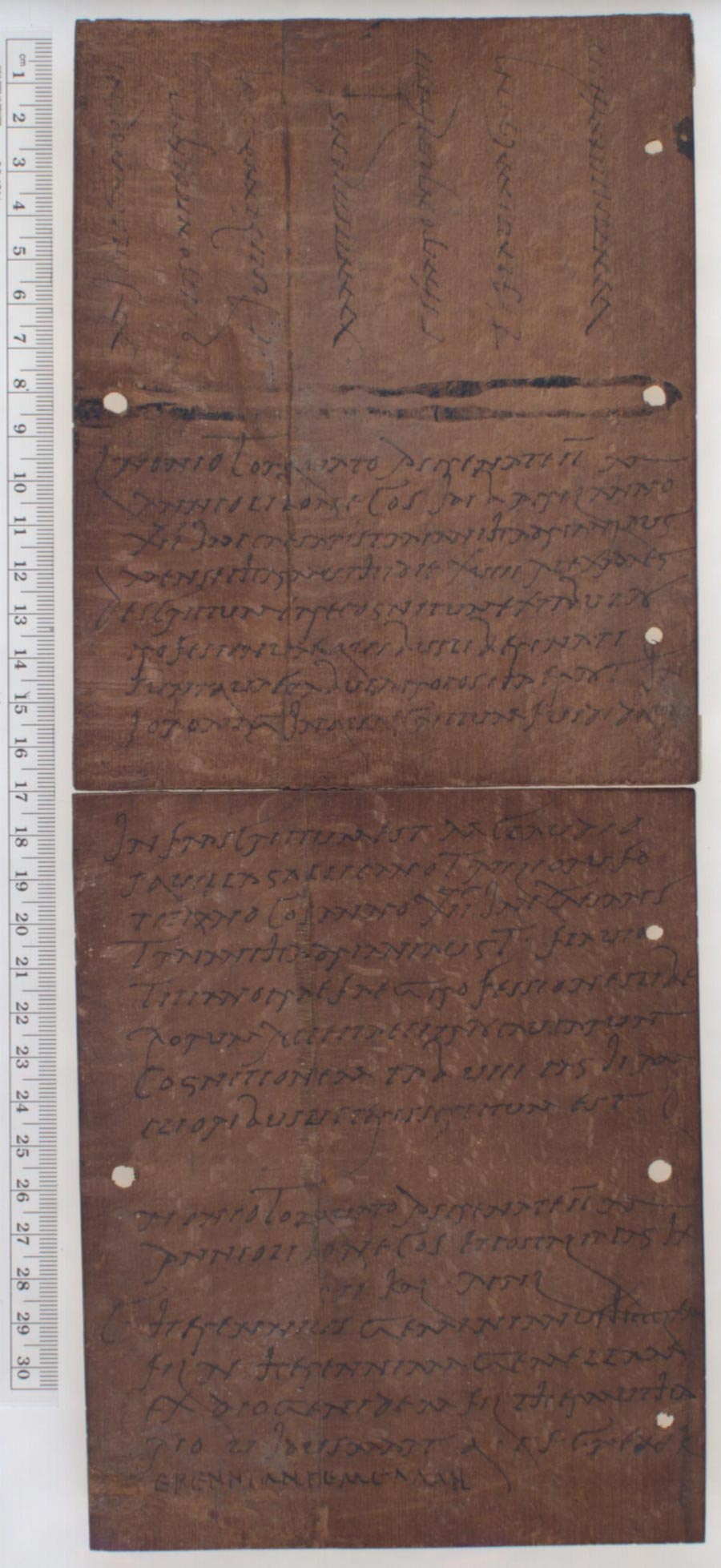 Birth certificate of Herennia Gemella. Ink and wax on wood tablets. Egypt, written in Alexandria, found in the Fayum. Roman period, August 13, 128 ad The Papyrology Collection, Harlan Hatcher Graduate Library. P. Mich. inv. 766