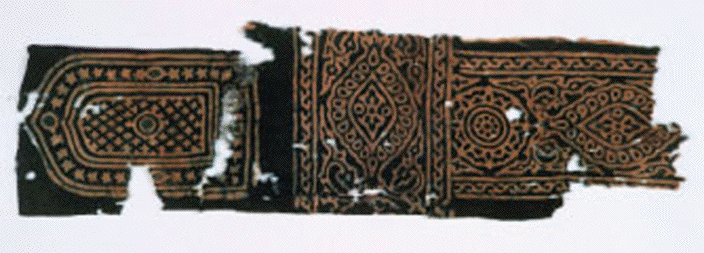 MEDALLIONS AND VINES Stamped resist, indigo dyed (main field may have been hand painted) Border designs with alternating medallions and roundels linked by vines Cotton Warp 40cm, weft 11cm Acc.No. 94105a
