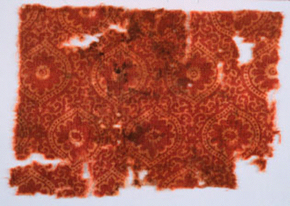 MEDALLIONS AND TENDRILS Stamped mordant, dyed red Medallions with flowers and a "pearled" edge, and stylized tendrils in interstices Cotton (?) 21.1cm x 17.3cm Acc.No. 94132