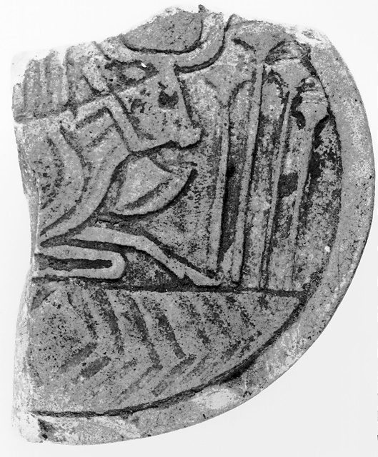 Fragment of necklace counterpoise with Hathor cow Faience; Egypt; New Kingdom (1570-1070 BCE); 4.5 cm h., 3.75 cm w.; Source: Bay View, 1971; Kelsey Museum 71.2.134