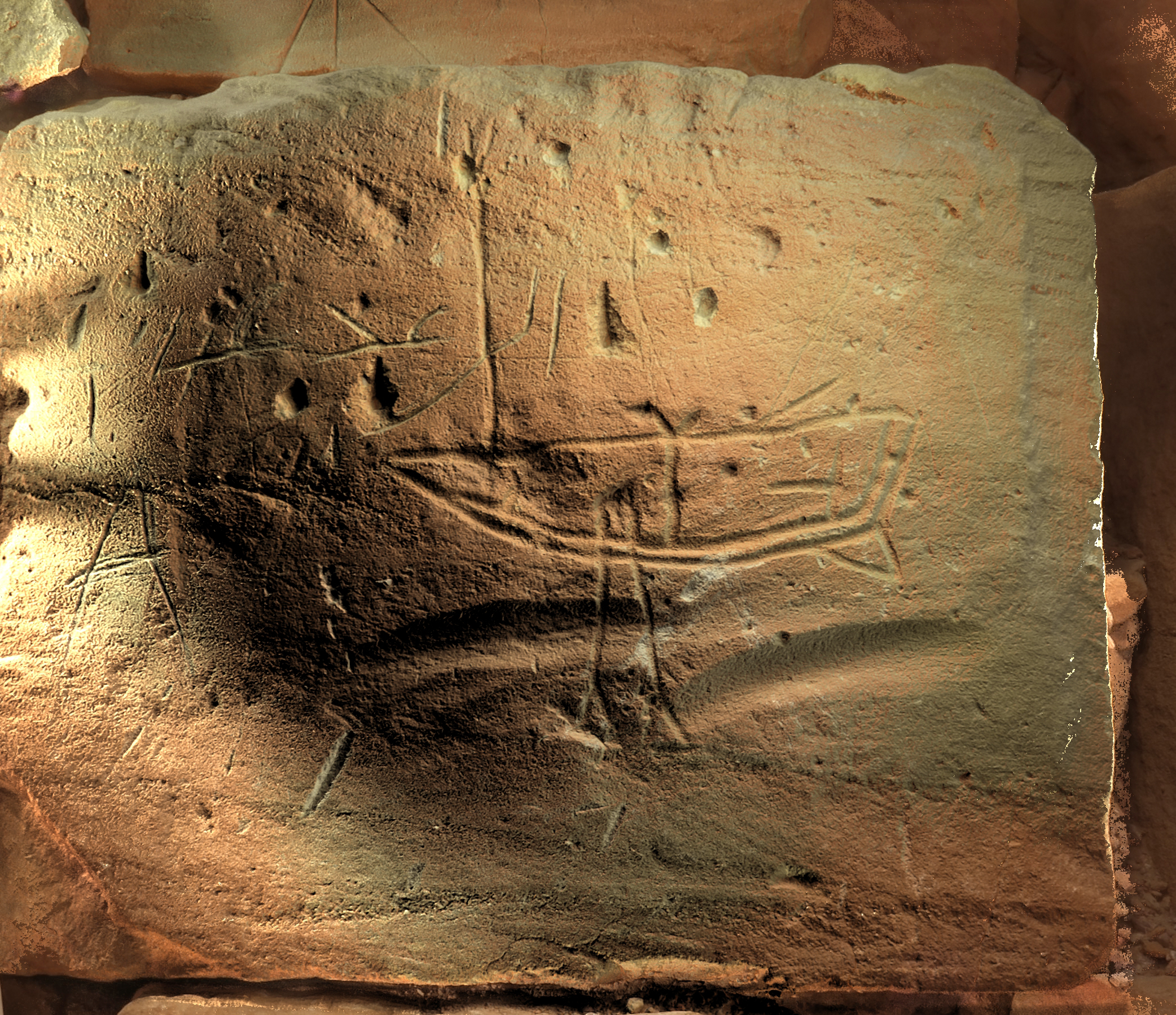 Incised toward the right side of its block, this type 2 boat does not occupy the surface completely. The outlined hull curves and tapers to a pointed bow. The stern is bent upward and is broader toward the top. The triangular rudder is attached to the hull tip-down and the tiller is a horizontal bar attached to an angled line extending up from the hull. The mast is far forward and has a crutch near the top, made by a line behind it that curves upward. The yard extends from bow to stern, resting in a forked crutch amidships. Just forward of the crutch, two long oars extend across the hull to triangular blades, base downward. A badly worn line curves from aft of the mast toward the forward oar, apparently a structure or load. This graffito appears to show a vessel going downstream, using oars, not for propulsion but to maintain steerage.