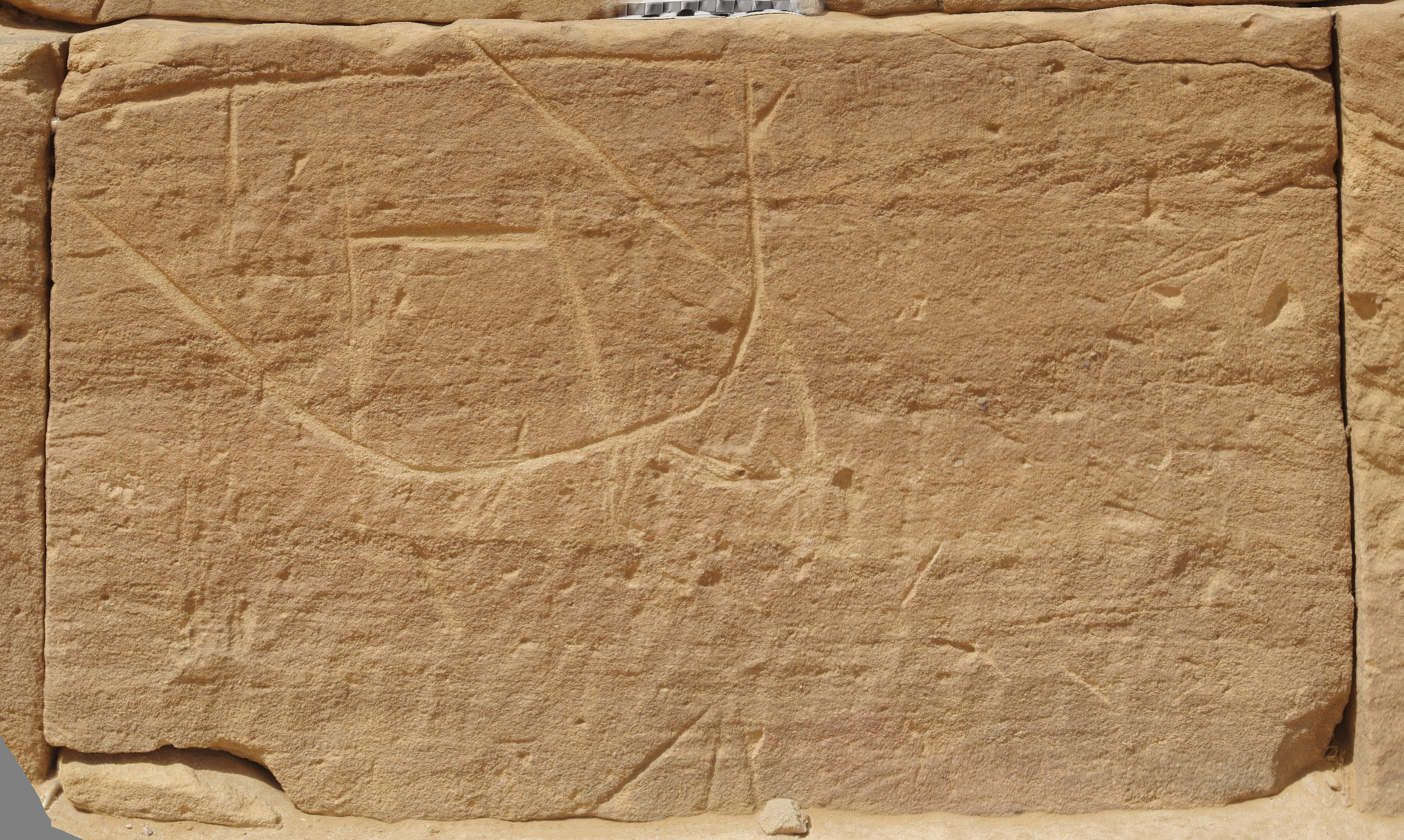 On the lowest course, north of the chapel, is a completely linear boat of type 3. The hull is almost flat and bends up at the long, angled prow and at the stern. Both the prow and stern are straight. A single short line extends backward from the stern, making a crutch. The rudder is curved but clearly related to the triangular rudders seen elsewhere, and the line defining it continues across the hull as an exaggerated tiller. There is a simple square cabin amidships. An incomplete vertical forward of the cabin is possibly a mast and the long horizontal above it probably a yard.