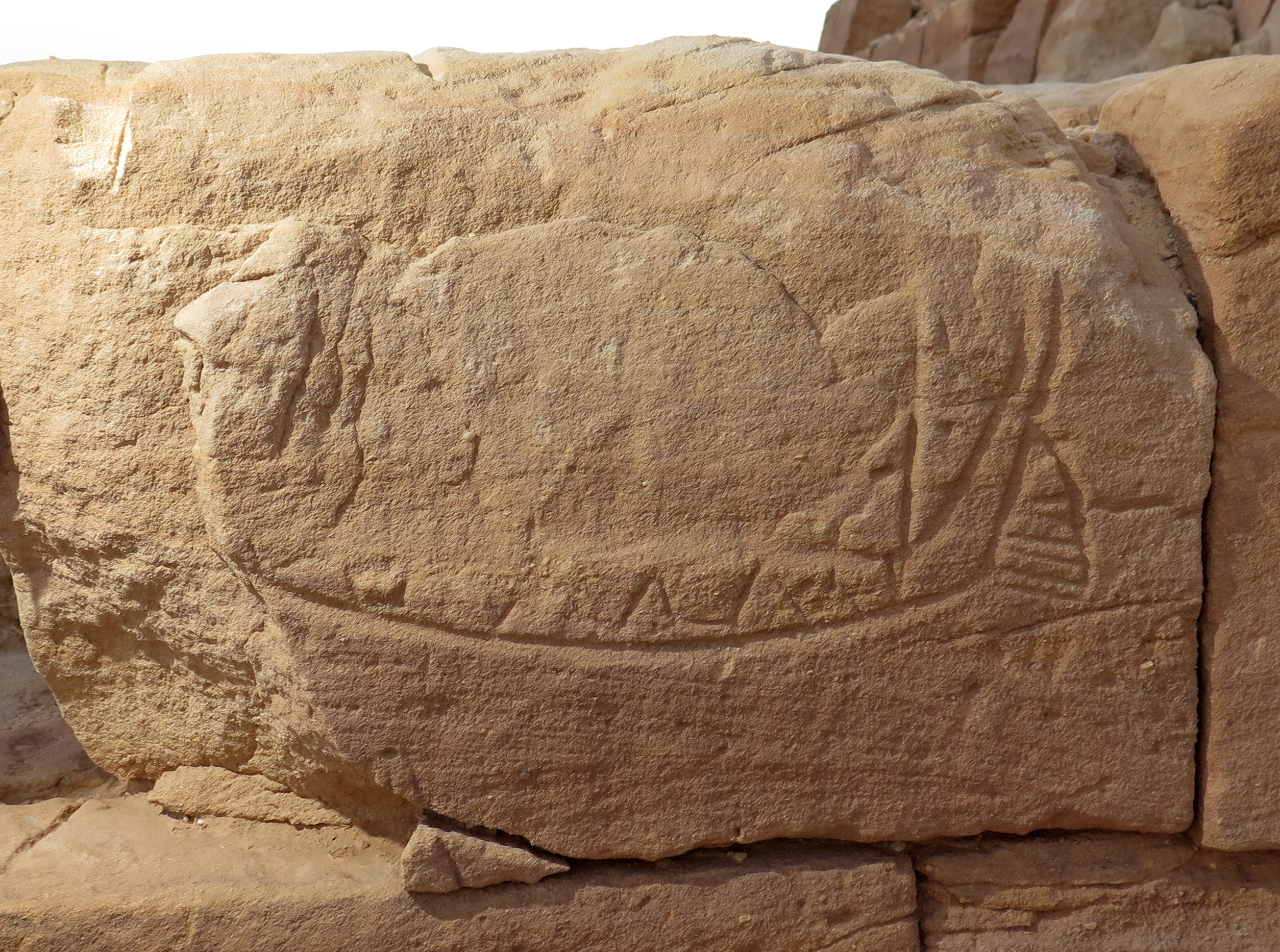 Only the lower part of the hull and the stern of this type 3 boat are preserved. The hull is slightly curved and filled with a zigzag pattern. The stern bends up sharply and is also slightly curved. Attached to the rear is a roughly triangular rudder filled with horizontal lines. The side of the rudder continues into the boat as the tiller. At the end of the tiller is a vertical line that probably indicates a cabin, now lost to erosion.