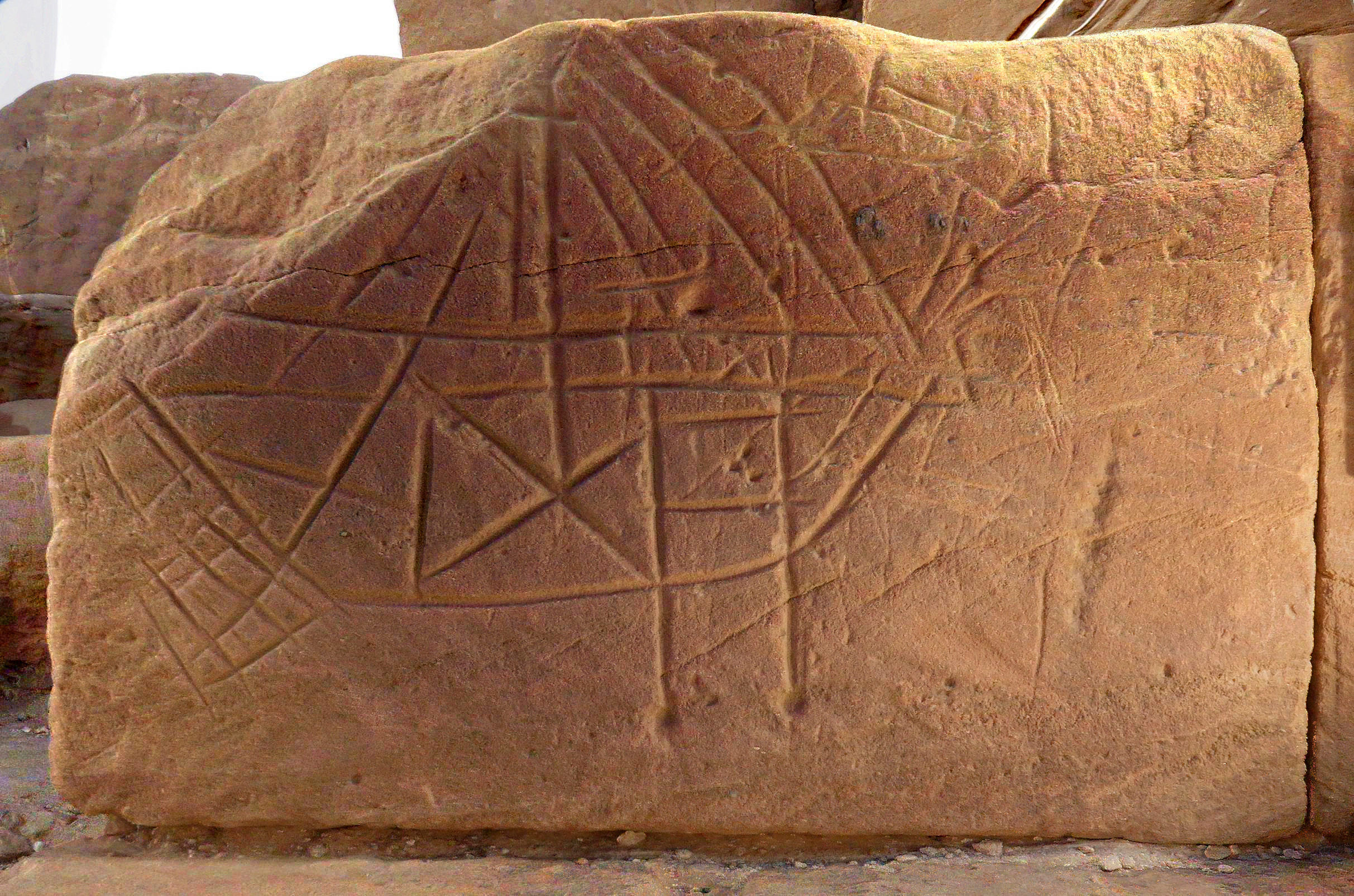 While this boat is boldly incised, its structures are confused such that it is difficult to interpret. The hull is partly outlined from the side, and apparently shown partly from above. In any case, some details are conjectural. The angled bow structure is outlined, as is the hull toward the stern. A structure seems to be attached to the hull at the stern; it is neither broad nor narrow, with a rectangular flag(?) attached to it. A rectangular rudder is embellished with crossed lines indicating planks.