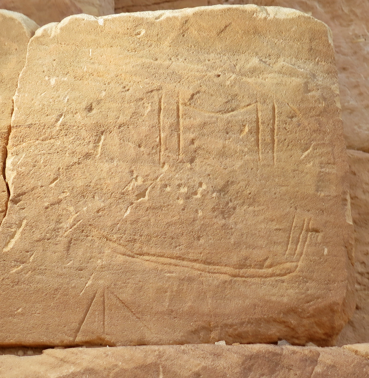 Above graffito P2 is a very simple quadruped. Four vertical lines indicate the legs with a curve for the belly and a single line for the tail. To the left, a curved line seems to indicate the neck. The rest is unclear, but this is almost certainly a camel, the hump being lost in the scaling in the stone above.