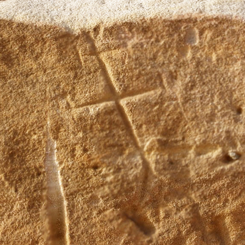 At the upper edge of the block is a cross potent. Also at an angle to the stone.