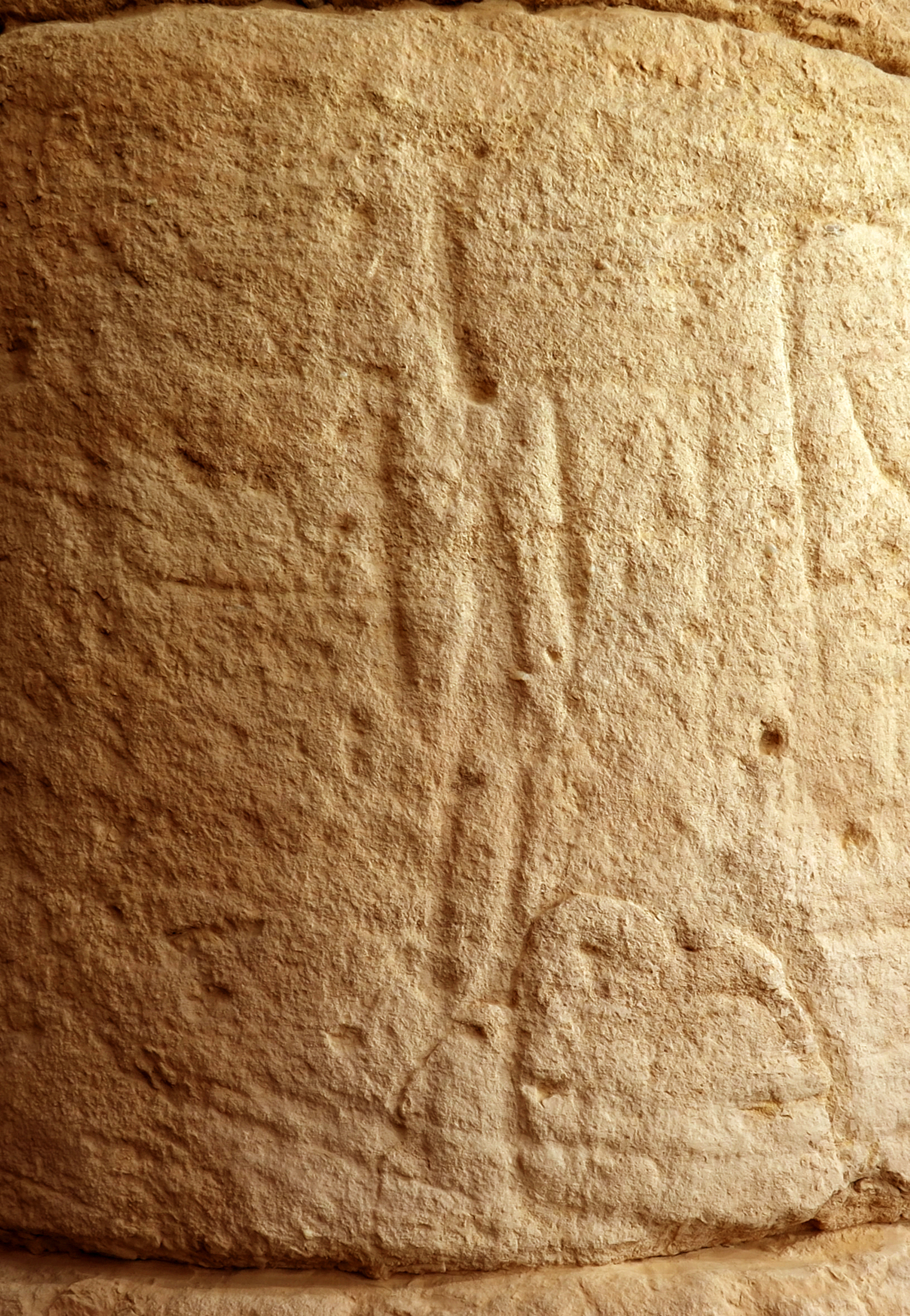 Although very worn, this graffito has a human shape, with a long neck, broad shoulders and torso, and long legs extending to feet that point to the right. The large, butterfly-shaped design over the torso is similar to graffito T50 and might indicate a shield or some other equipment or special clothing worn over the front of the body.