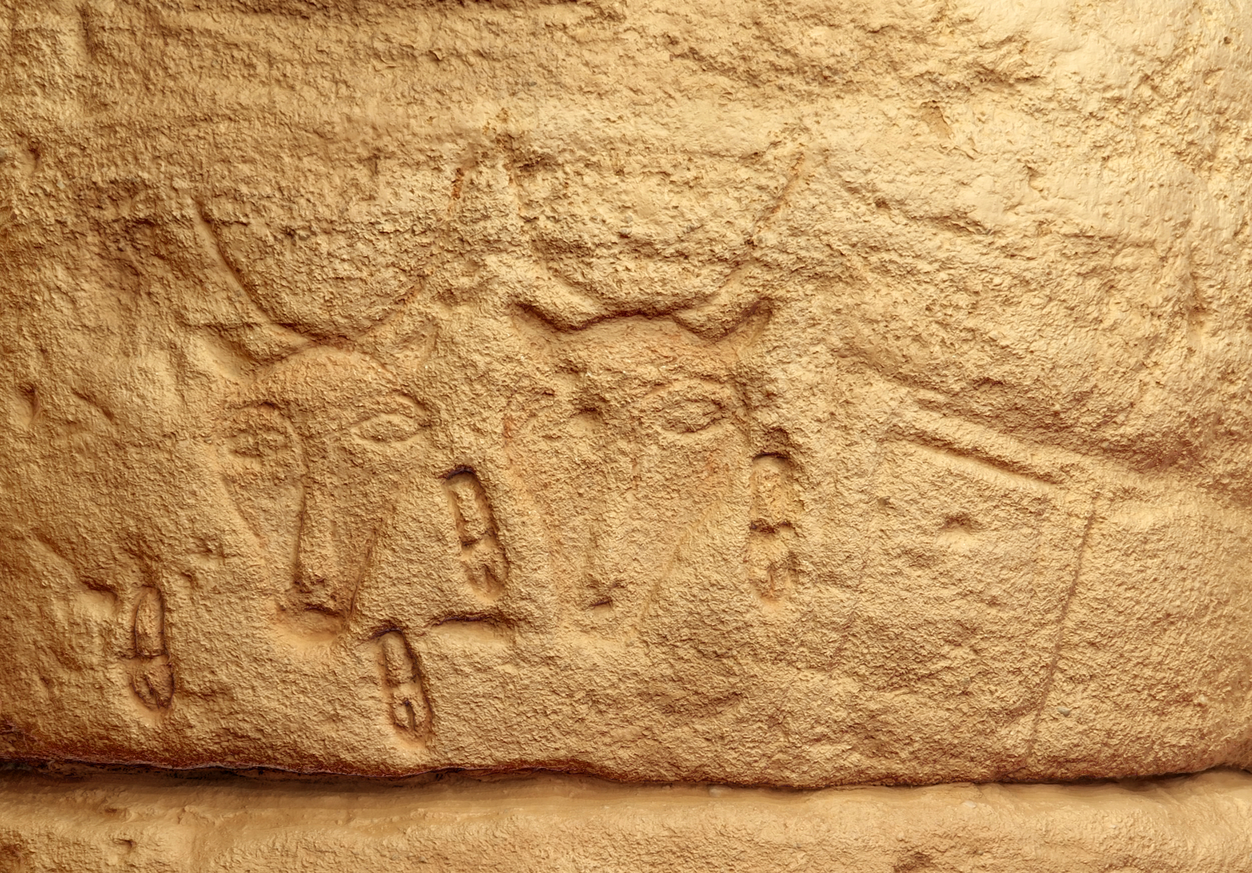 Two small, horned cattle heads with narrow, elongated noses and human eyes. The heads are surrounded by four tiny, hoofed feet. A small square shape to the right may represent an altar or an offering table, albeit without a spout. It may also represent an enclosure.