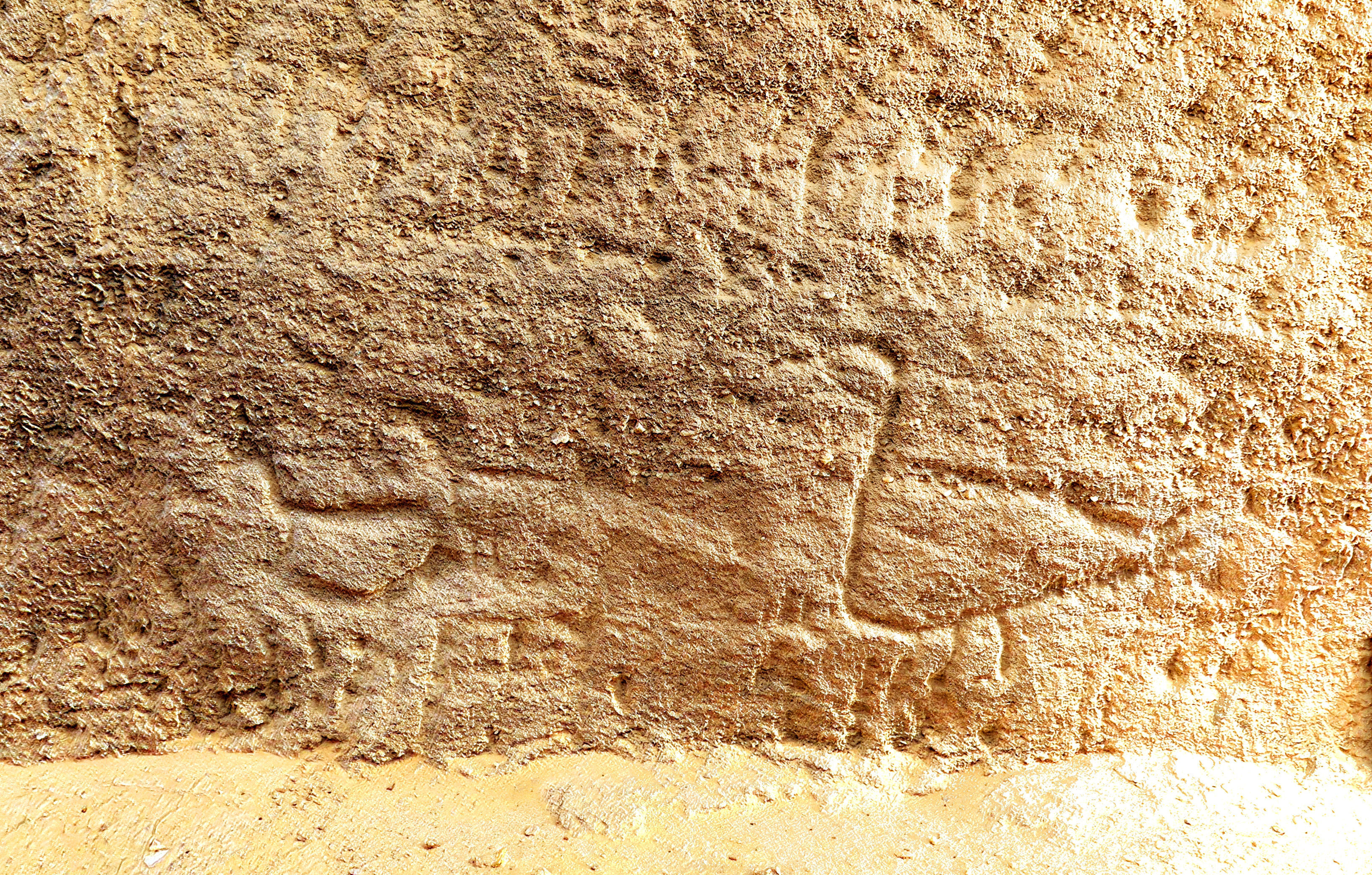 Difficult to make out, these three birds are the only graffiti in the temple that are carved on the rough rock-cut walls of what was originally the quarry, rather than being on the shaped and smoothed columns or the built stone wall dividing the two outer rooms. They are also significantly larger than the other examples of bird graffiti in the temple.