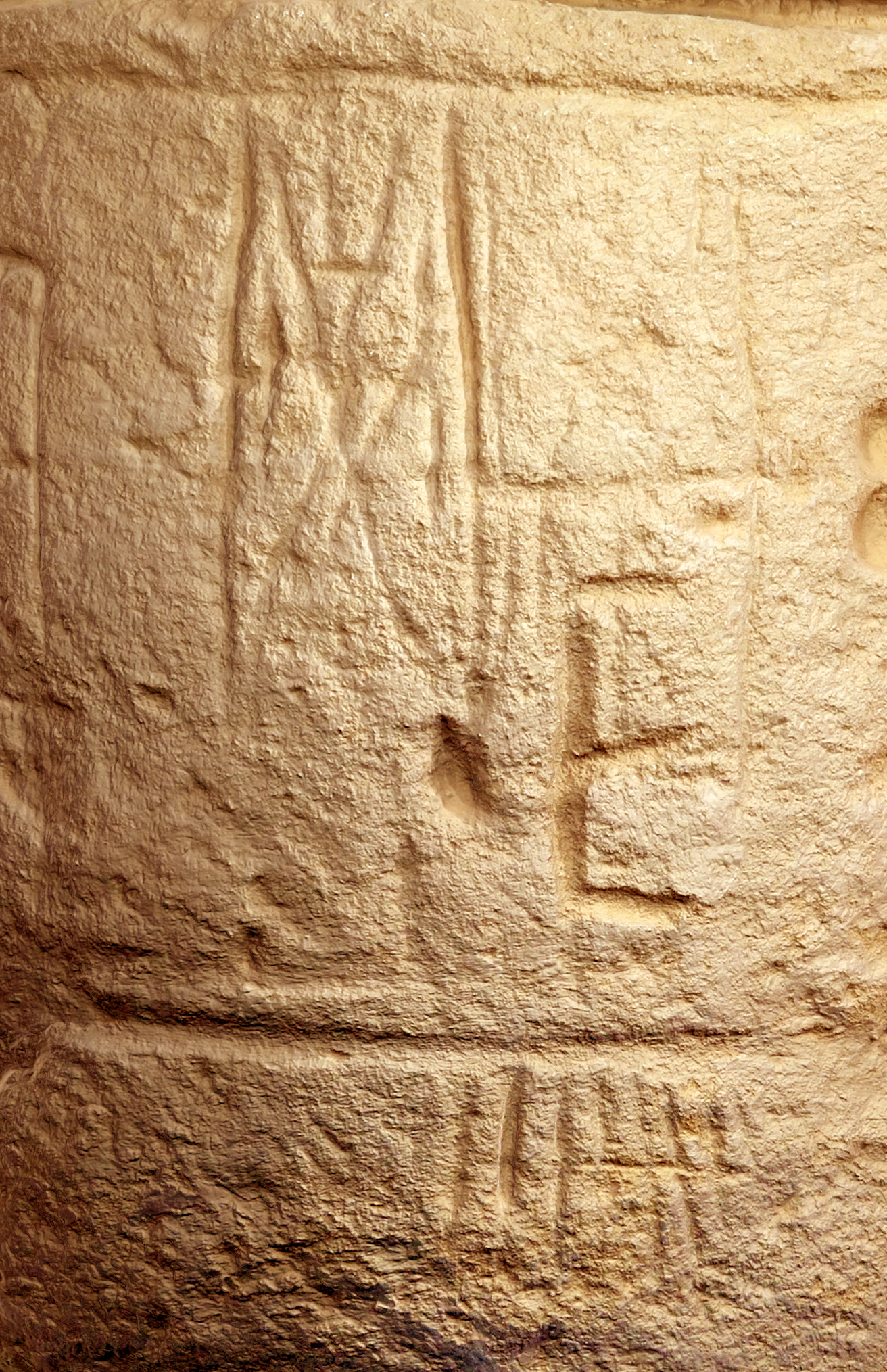 This graffito, located just to the left of center at the top of the image, is similar in shape to the elongated butterfly design seen over the center of the figure’s torso in graffito T4. It is located among a confusing assortment of other faint marks, including what might remain of the fringe from a textile design at lower right, and it is not unlike the patterning seen inside larger textile graffiti like T37 and T38. The letter E, at center right, is a modern addition.