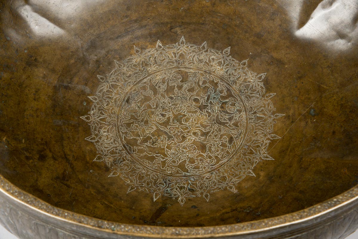 Although dented and worn, this large brass basin originally would have shone brightly with silver and gold inlay. The different metals would have played with the light as it hit the concave and convex surfaces. The outlines of inscription bands and pictorial motifs remain. Around the basin's outer surface, a large calligraphic inscription praises the last Ayyubid prince Najm al-Din Ayyub. The interior of the basin includes a design known as a fishpond motif. The incised circle is filled with the outlines of dozens of small fish that appear to be swimming about. When filled with water, the reflective metal and the basin's contents would have animated the fish, making it appear as though marine life had infiltrated the libations.