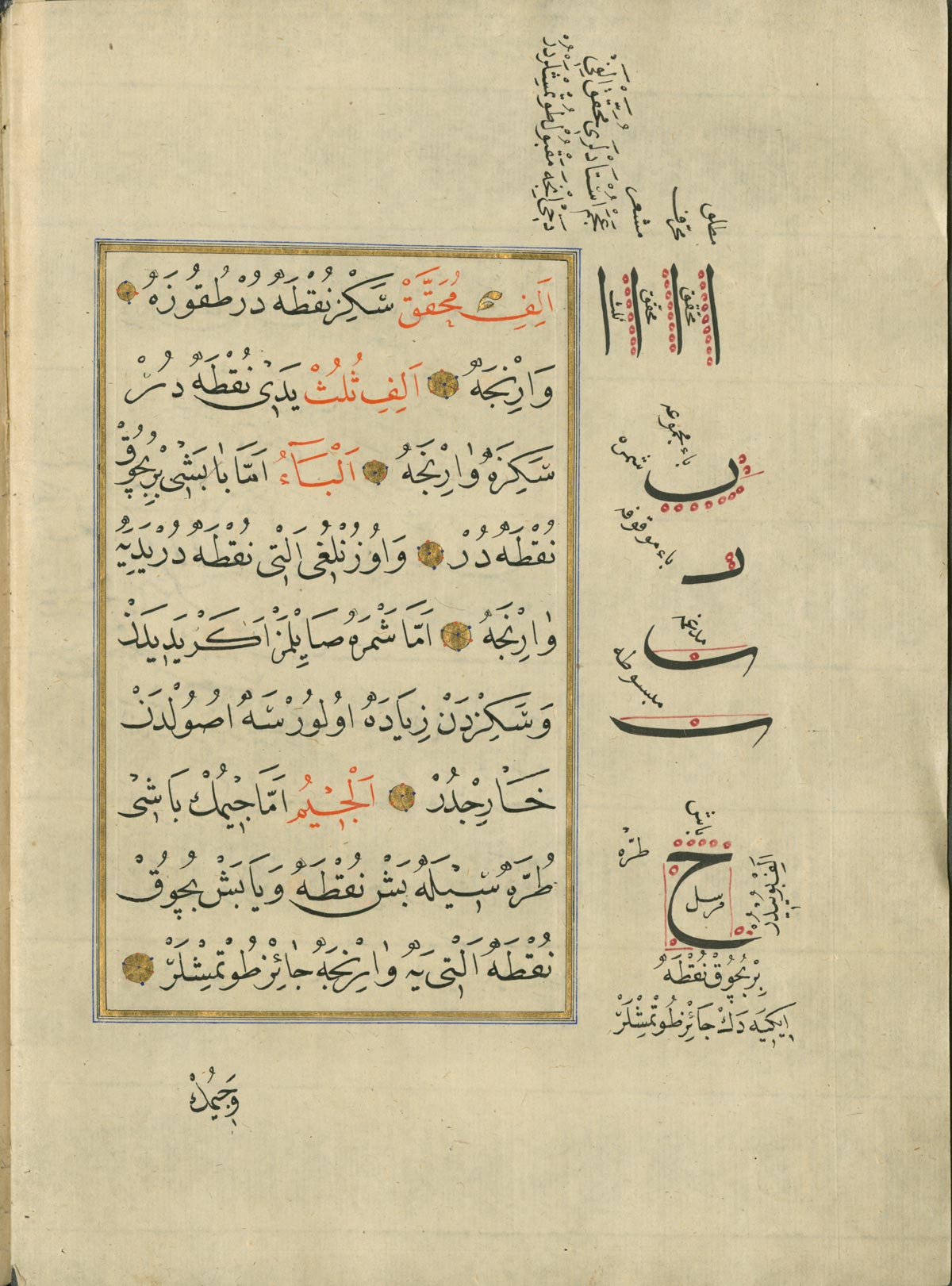 Calligraphy in the Arabic script is created using a system of proportions based on the rhomboid. This shape is formed when the ink-soaked tip of the reed pen is pressed onto a writing surface like paper. In this calligraphic treatise written in Ottoman Turkish, the scribe demonstrates the rhombic system in the margins, measuring each Arabic letter with rows of red circles.