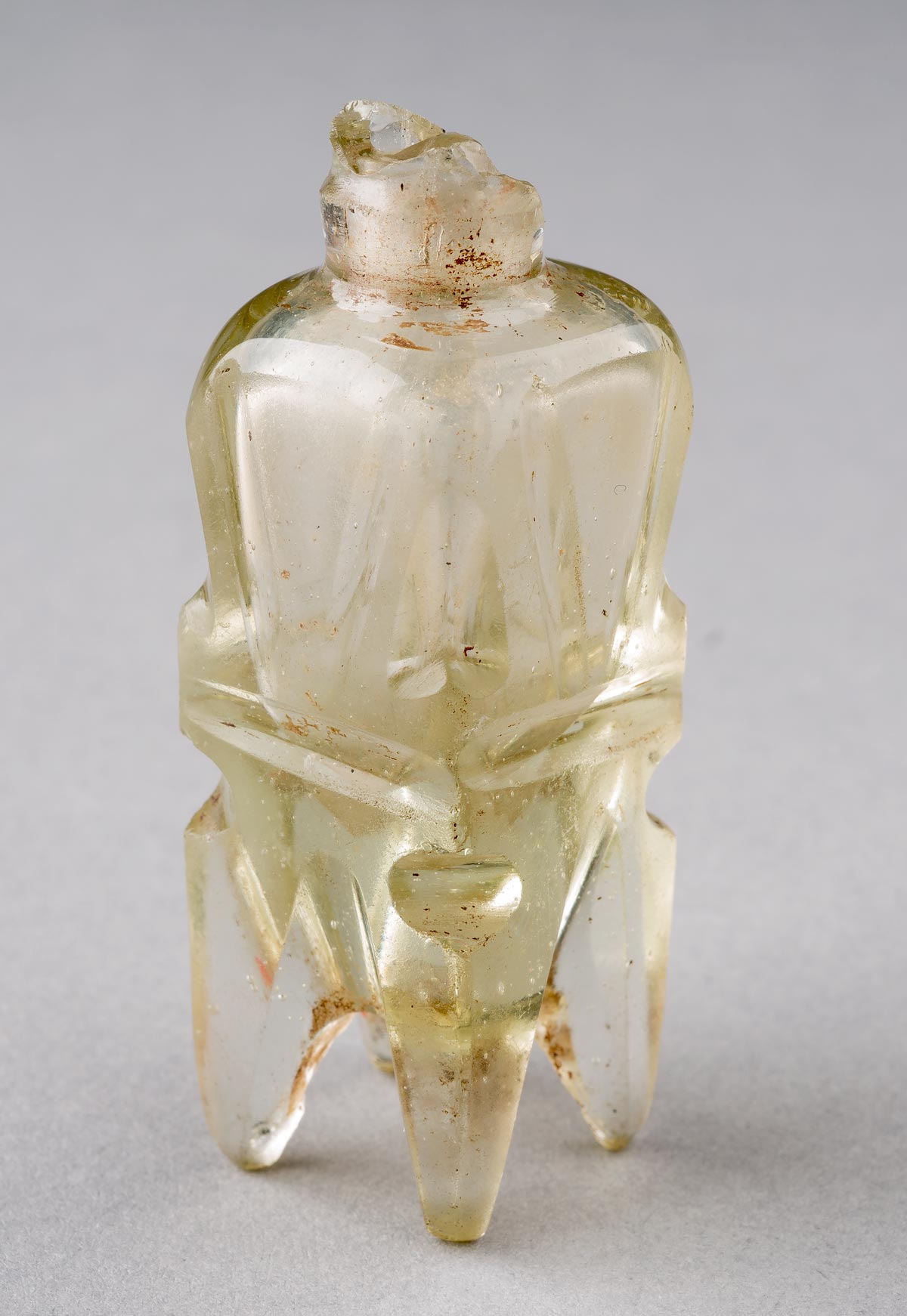 This clear glass vial was formed and decorated by a wheel-cutting technique that was popular during late antiquity and later revived during the medieval period in Islamic lands. The small vessel was likely used to house cosmetics such as kohl or unguents such as perfumes and essential oils. The shape of the minute vessel, with its four feet and chiseled sides, has earned it the appellation "molar flask."