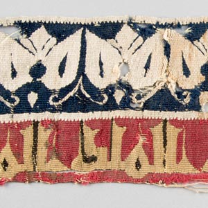 This tiraz (inscribed) fragment stands out not only for its painted gold inscription but also for its complex patterning of color, which is achieved by resist-dyeing the warp threads prior to weaving the cloth. This technique, known as ikat, is characteristic of Central Asian textiles. This particular color palette and ikat pattern, however, were commonly used in tiraz textiles produced in medieval Yemen, after which imitations started to be produced in Egypt.