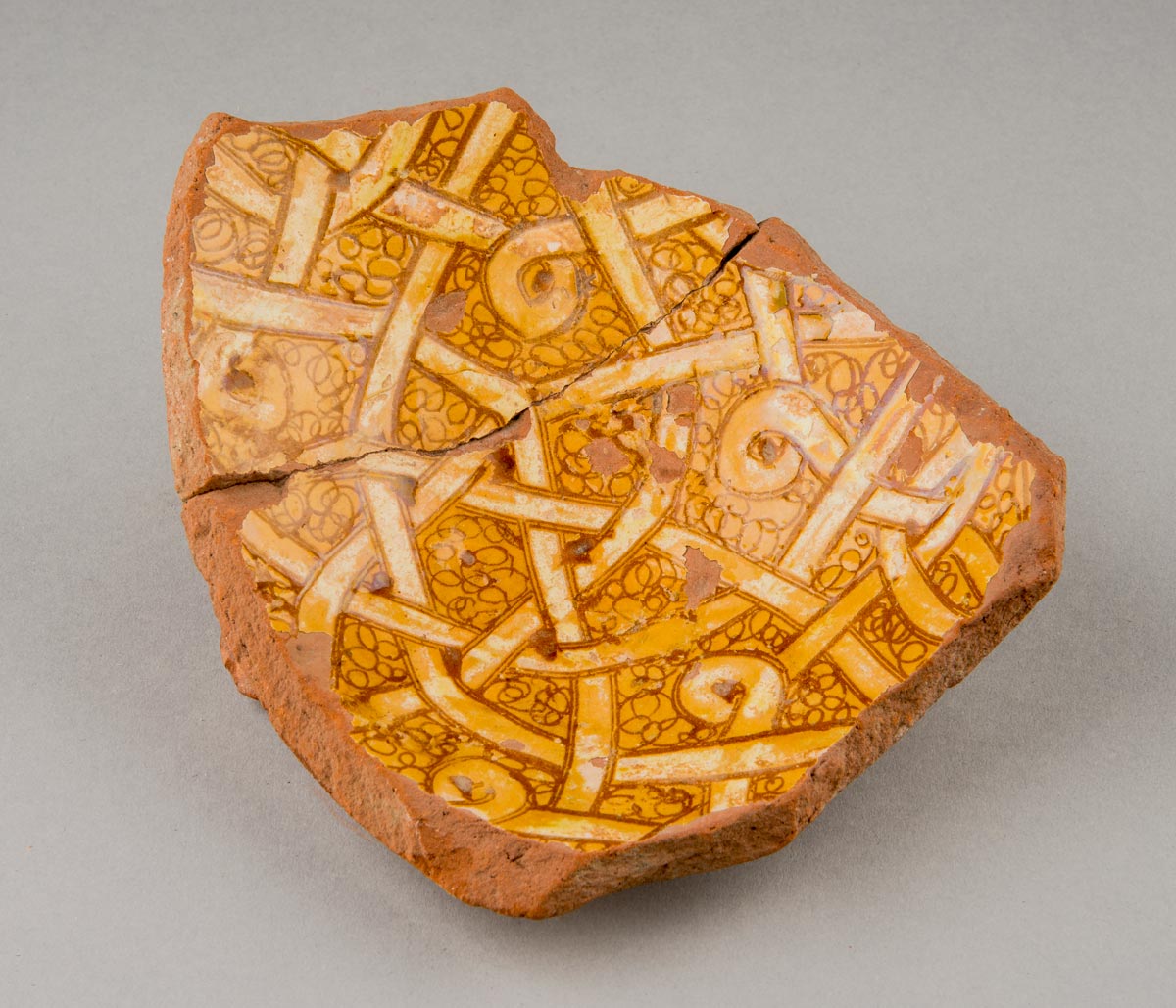 This sherd displays both the decoration and color scheme characteristic of pottery made in Egypt during the 14th century. The vessel's body is made of red clay, while the ornamentation is incised in a white slip under an amber glaze. The knotted patterns resemble those found in contemporary metalwork and textiles. Besides interlacing designs, ceramic vessels similar to this one also include inscriptions and blazons, the latter a hallmark of Mamluk art.