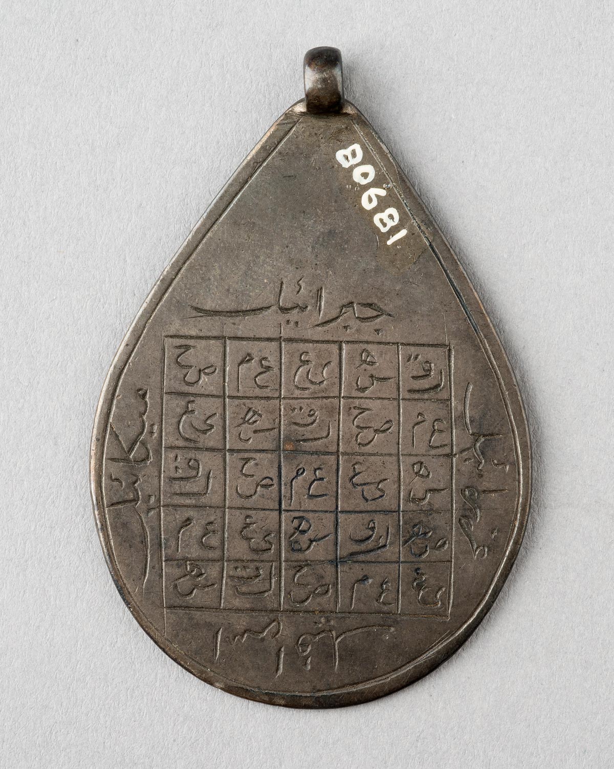 This tear-shaped lead amulet is clearly a pendant meant to be worn. It includes inscriptions on its front and back, which are intended to physically and spiritually protect the wearer. At the top of the amulet's front side appears the phrase "Ya Hafiz," which invokes God as the "Protector" (Hafiz). Below, a circle of intersecting words (forming a six-pointed star) provides the names of the Seven Sleepers of Ephesus, ancient legendary figures who are said to have slept for hundreds of years. The Sleepers are mentioned in the Qur’an (18:9–26), and in later centuries it was believed that inscribing and reciting their names could protect an individual from harm. On the amulet's back side, a five-by-five grid comprises a magic square, or murabba‘. Within this checkerboard design are inscribed pairs of letters that are slight permutations of the so-called mysterious letters initiating some chapters in the Qur’an (here, chapters 19 and 42). Encircling the magic square are the names of the four protective archangels: Gabriel, Michael, Israfil, and ‘Azra’il.