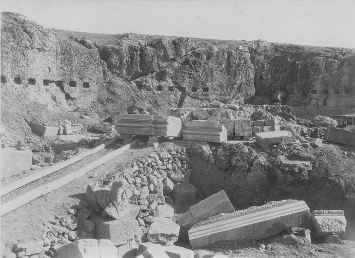 The Temple of Augustus under excavation. The foundation of the Temple and at the left the “causeway” that was constructed to aid in reconstruction. Rock semicirclular back wall of the Imperial Cult Sanctuart in the background.