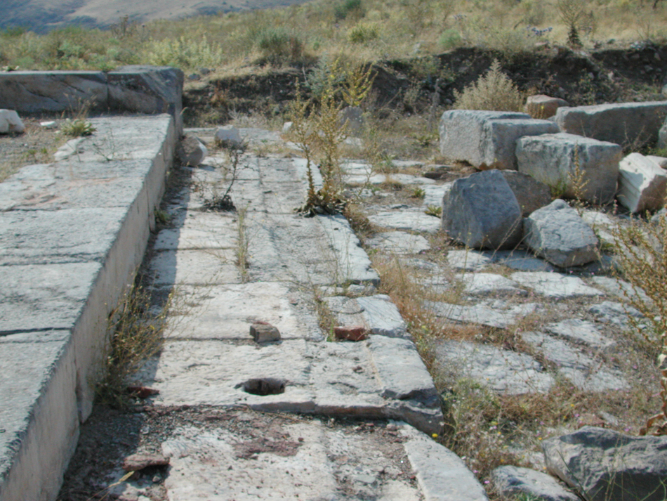 The southern (front) side of the Nymphaeum from the West showing the cutting for the draw basin of the second phase and a drain hole for the same. At right is paving.