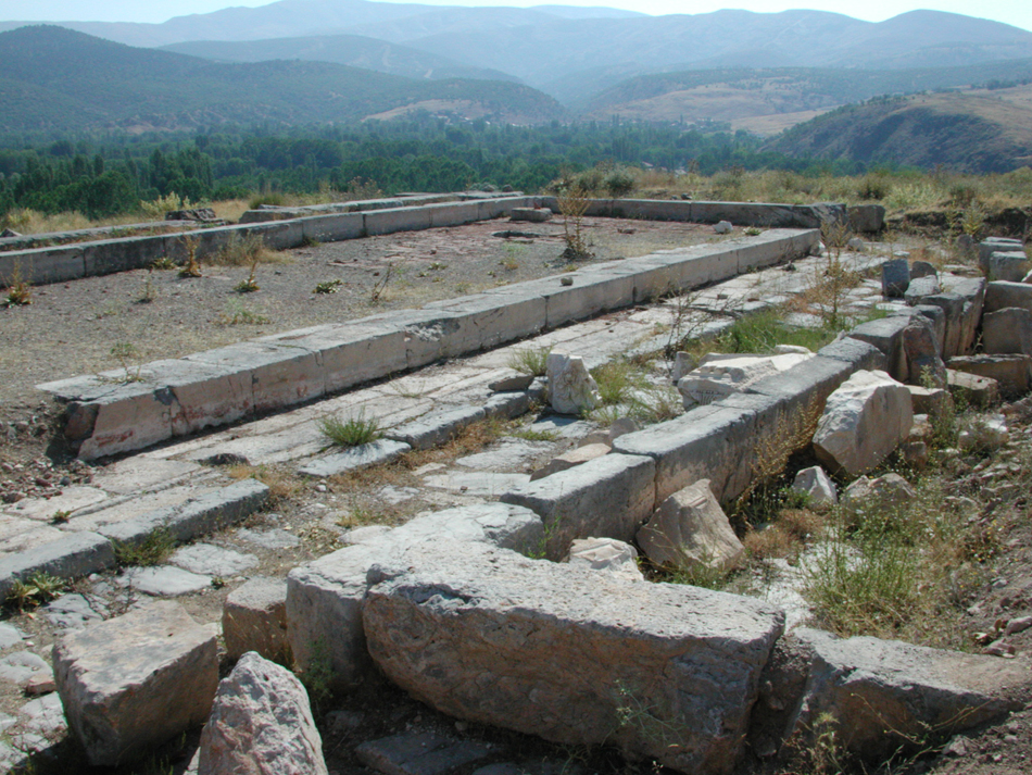 The terminal Nymphaeum from the WSW with the mountains from which the aqueduct leads the water at top.