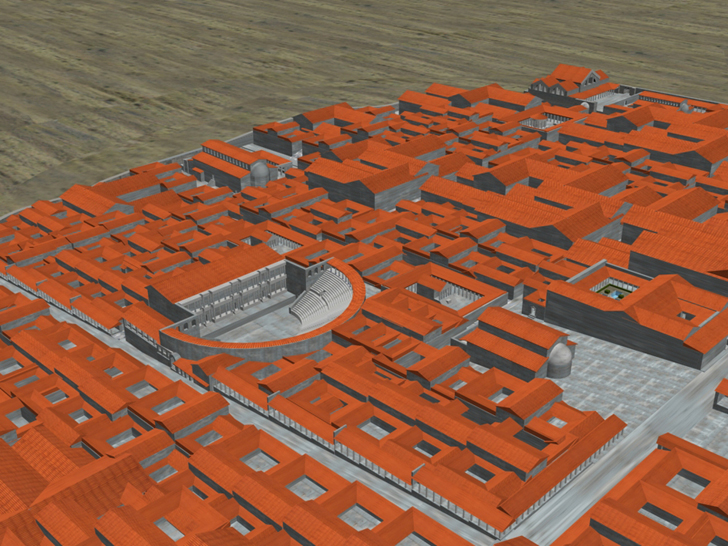 The Theater is at center with the Basilica "of St. Paul" above and the Central basilica to the right. At top right is the Bath Complex, and the junction of the Cardo and the Decumanus is at bottom right.