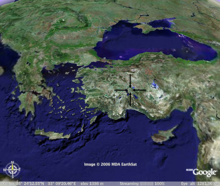 The Eastern Mediterranean with the Black Sea at top right. At left is Greece. Antioch is framed by arrows in central Turkey.