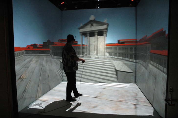 The Imperial Cult Sanctuary is viewed in the CAVE. The CAVE provides a stereoscopic, life-sized, 3D virtual reconstruction of the entire city that can be completely navigated. The Image on the screens appears blurred, because special glasses that alternately block the view of each eye at the frame rate must be worn to percieve the full effect.