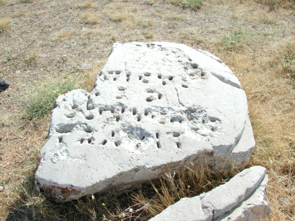 A stone disk with holes for the attachment of bronze letters in the Tiberia Platea.