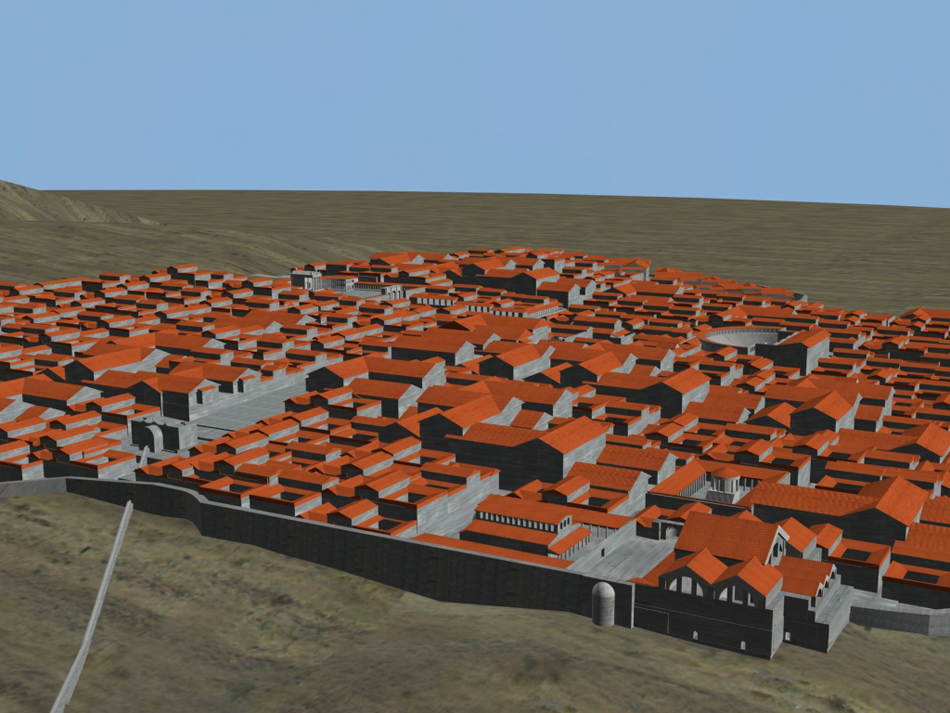 At left, the aqueduct enters the city and empties into the recieving tank at the back of the terminal Nymphaeum. At right bottom is the Bath Complex.