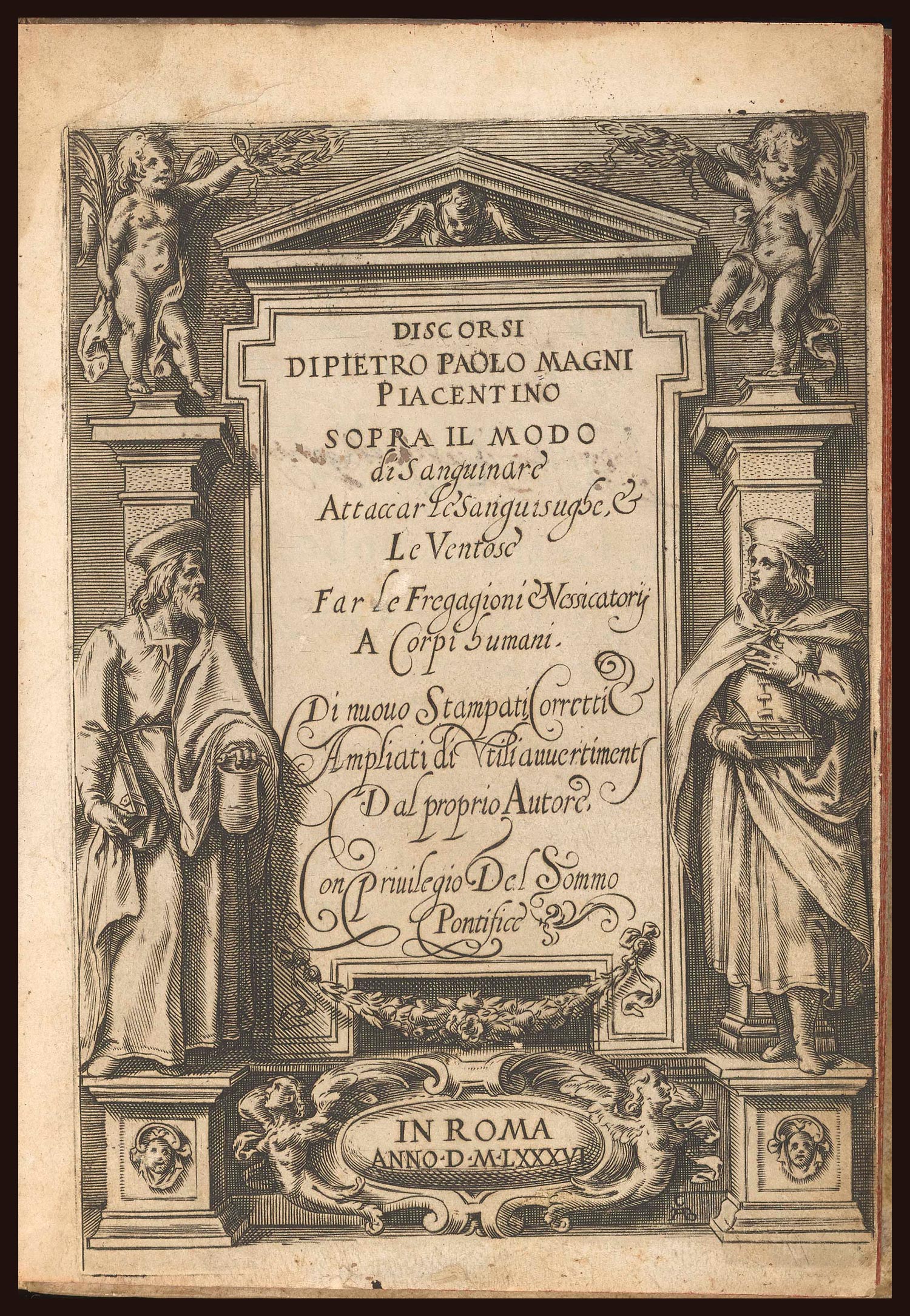 Discorsi di Pietro Paolo Magni Piacentino sopra il modo di sanguinare, attaccar le sanguisughe, & le ventose far le fregagioni & vessicatorii a corpi humani Rome: Bartholomeo Bonfadino, nel Pellegrino, 1586 The Le Roy Crummer Collection