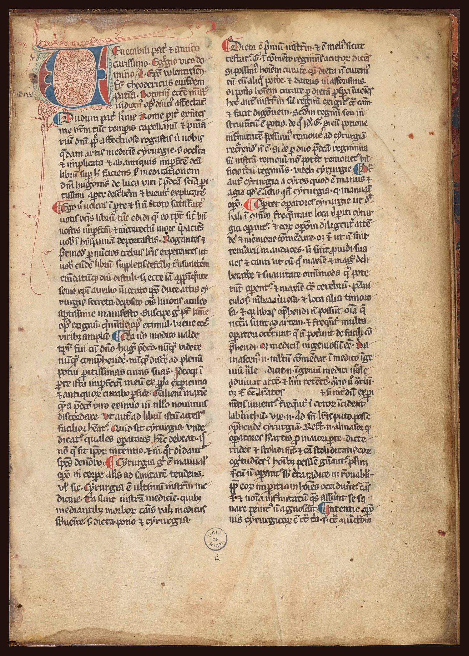 This manuscript contains the four books on surgery (Chirurgia) by the Dominican friar Teodorico Borgognoni of Lucca. He advocated the use of antiseptic surgery at a time when it was believed that pus was a beneficial sign of healing (supposedly for facilitating the elimination of unhealthy humors from the wounded body). He criticized the practice of using unguents and poultices to generate pus in a wound. Truly, he described his innovative surgical techniques in detail, including procedures for cleaning the wound, eliminating dead tissue, and closing the walls of the wound by using stitches.