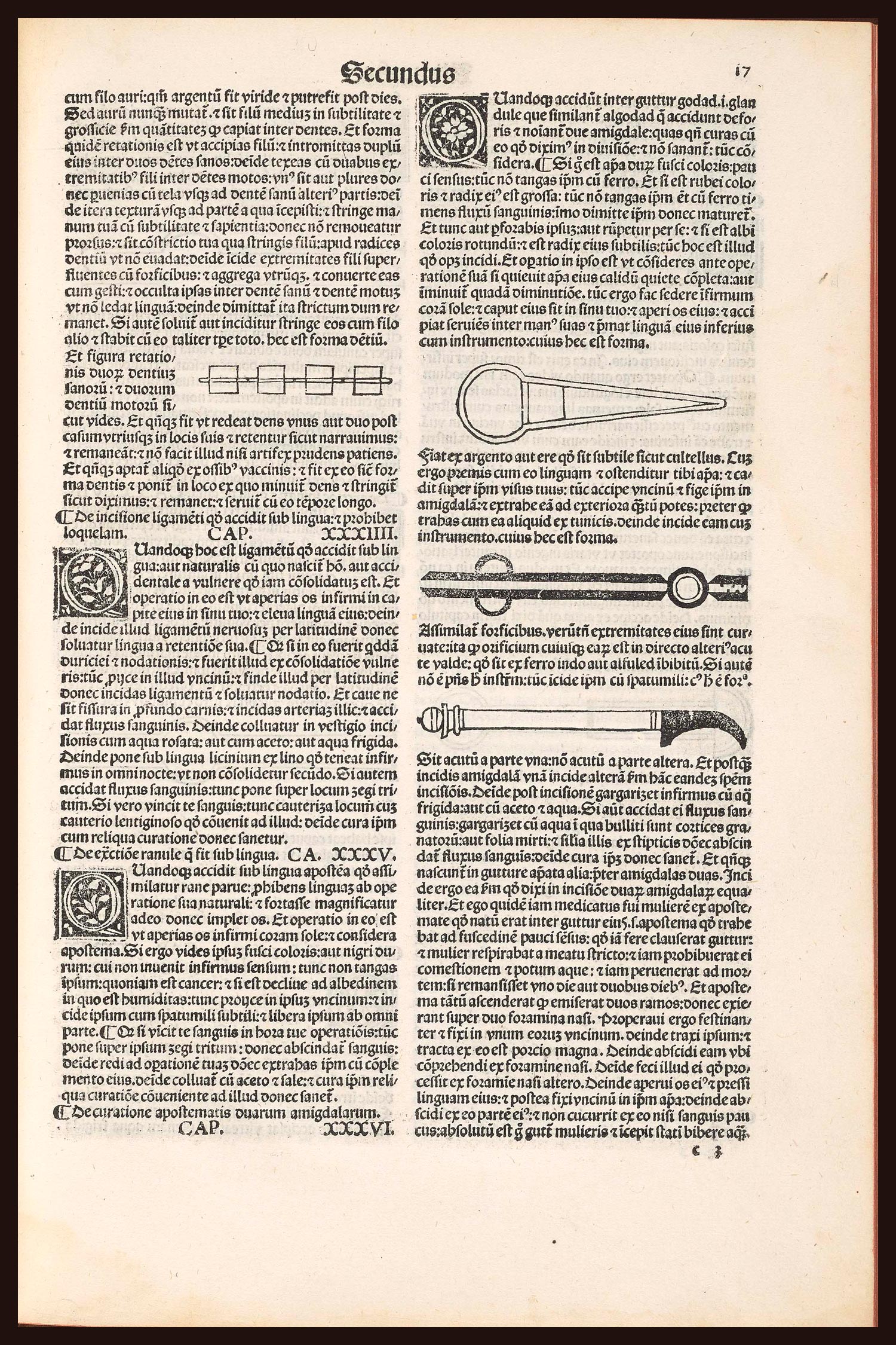 As shown on this page, Albucasis explains how to fix two loose teeth between two healthy ones, suggesting that they should be wired to one of the sound teeth with a silver or gold wire; and on the second column of the same page, Albucasis describes the procedure for tonsillectomy (extraction of the tonsils) including a description of the relevant instruments: