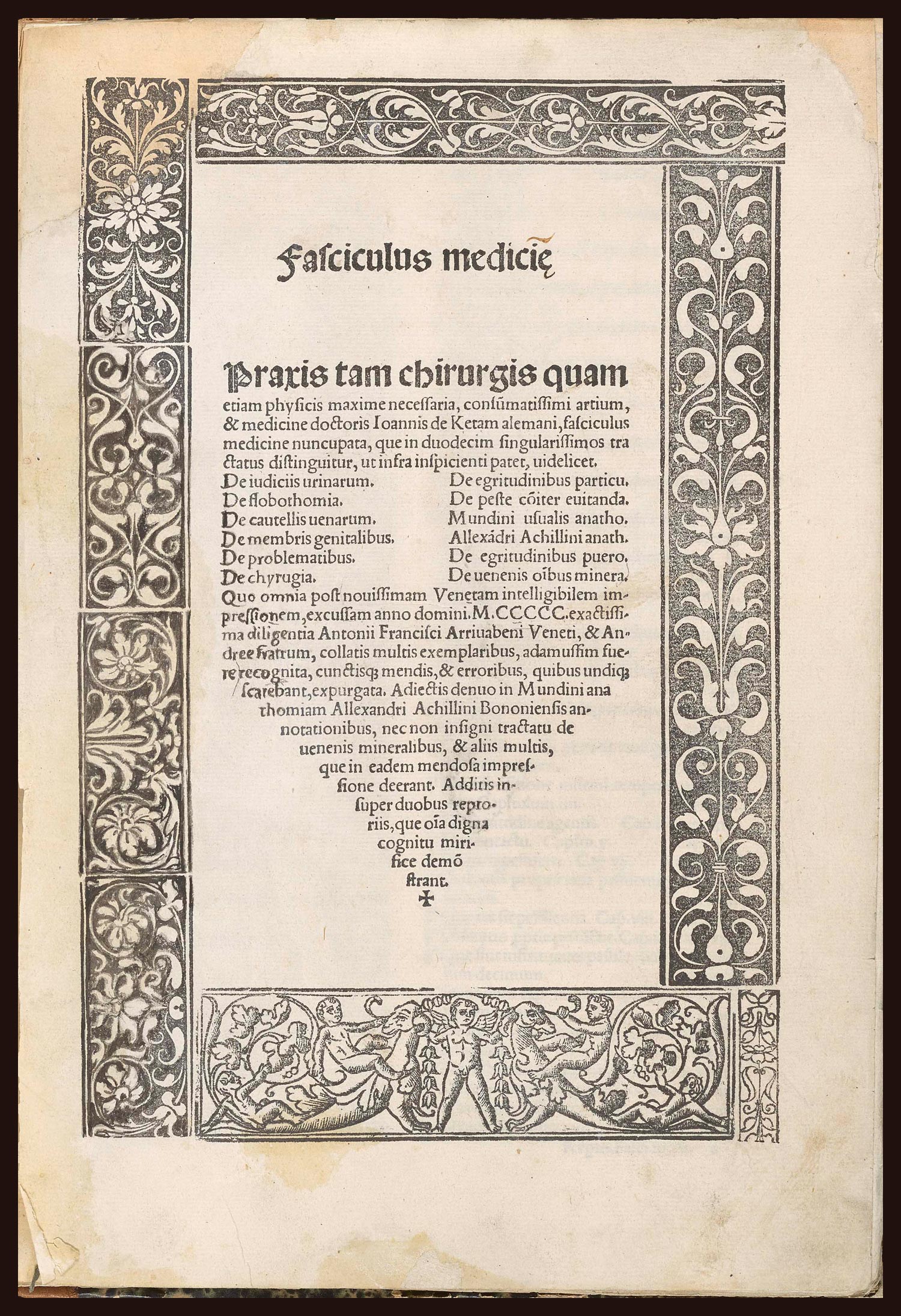 This book consists of a miscellaneous selection of short medical treatises from the thirteenth century onward, written by several authors and illustrated by full-page illustrations. The illustrations represent old medical practices and anatomical illustrations that became standard in early printed books: the uroscopy diagram, the phlebotomy man, the “Zodiac Man,” the seated woman displaying her internal organs, the wound man, and the dissection lecture. The author of this compilation was probably Johannes Kellner von Kircheim, a physician and professor of medicine in Vienna.
