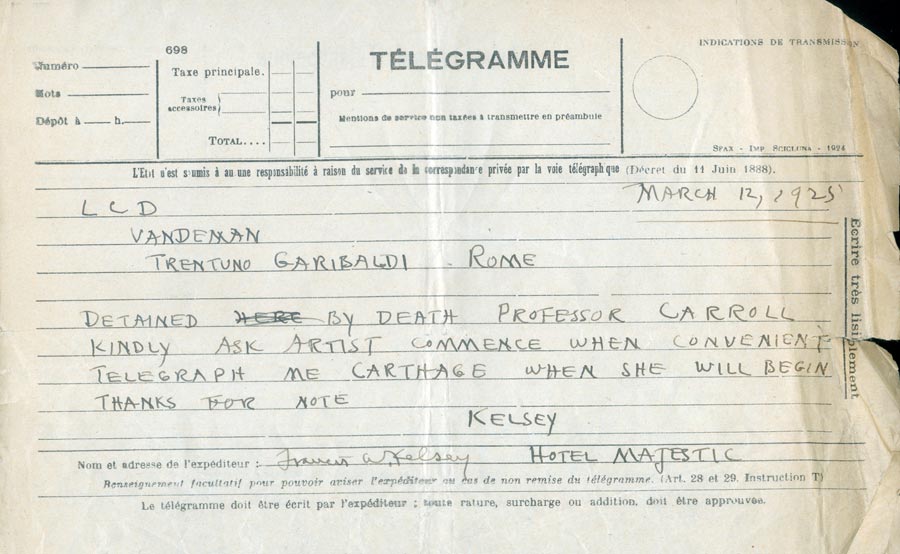 Telegrams sent March 12–14, 1925, between Esther Van Deman in Rome and Kelsey in Carthage regarding the start of Barosso's work at the Villa Bentley Historical Library, Kelsey Museum Papers