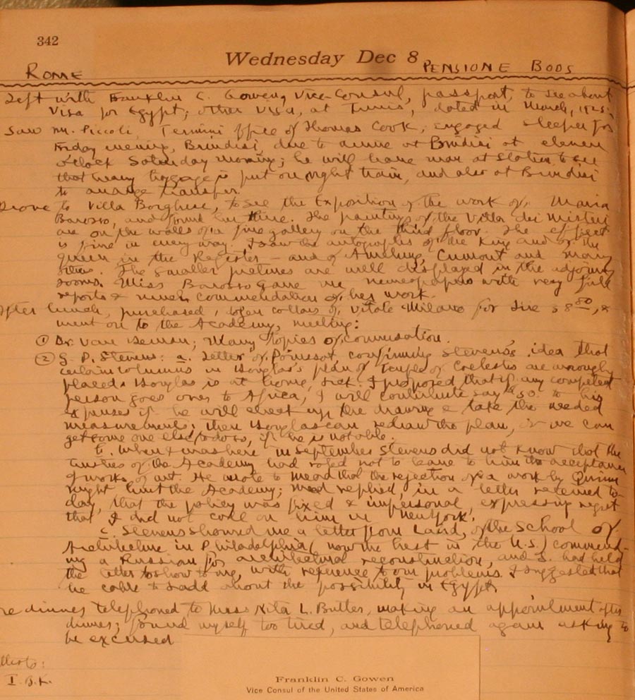 Diary of 1926 recording Kelsey's visit to the exhibition of Barosso's work Bentley Historical Library, Kelsey Museum Papers