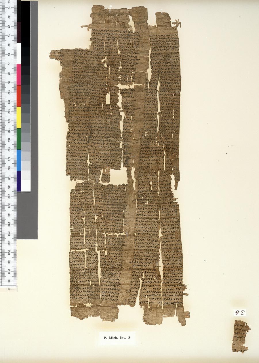This papyrus was found in 1924 in Karanis, during Kelsey's excavations. The large fragment is from a book-roll that contained the first book of Homer's Iliad. The two preserved portions contain parts of the middle and end of the bookâAchilles' conversation with his mother Thetis and her intervention on his behalf with Zeus. Note the neat handwriting and the layout of the text in columns.